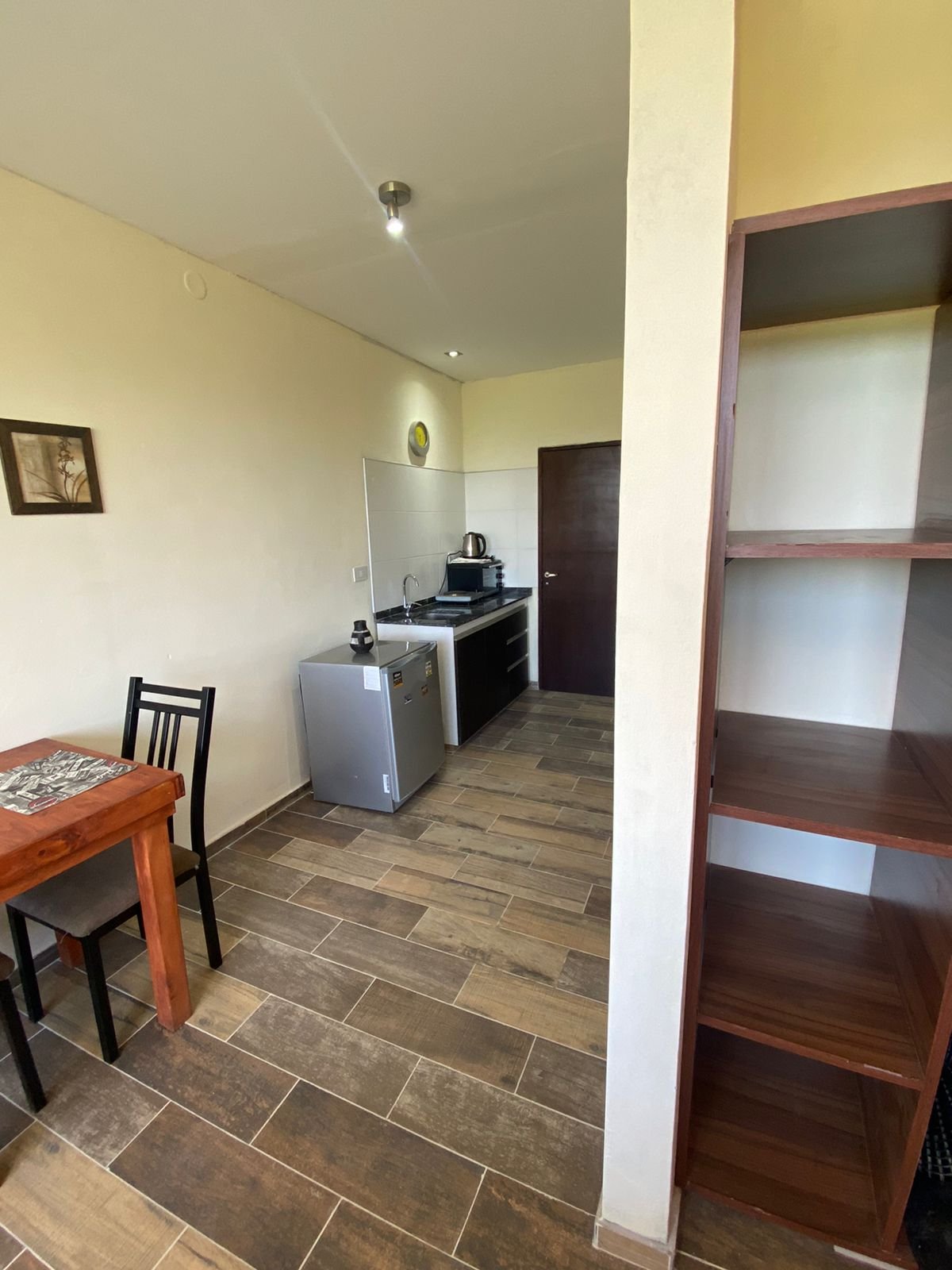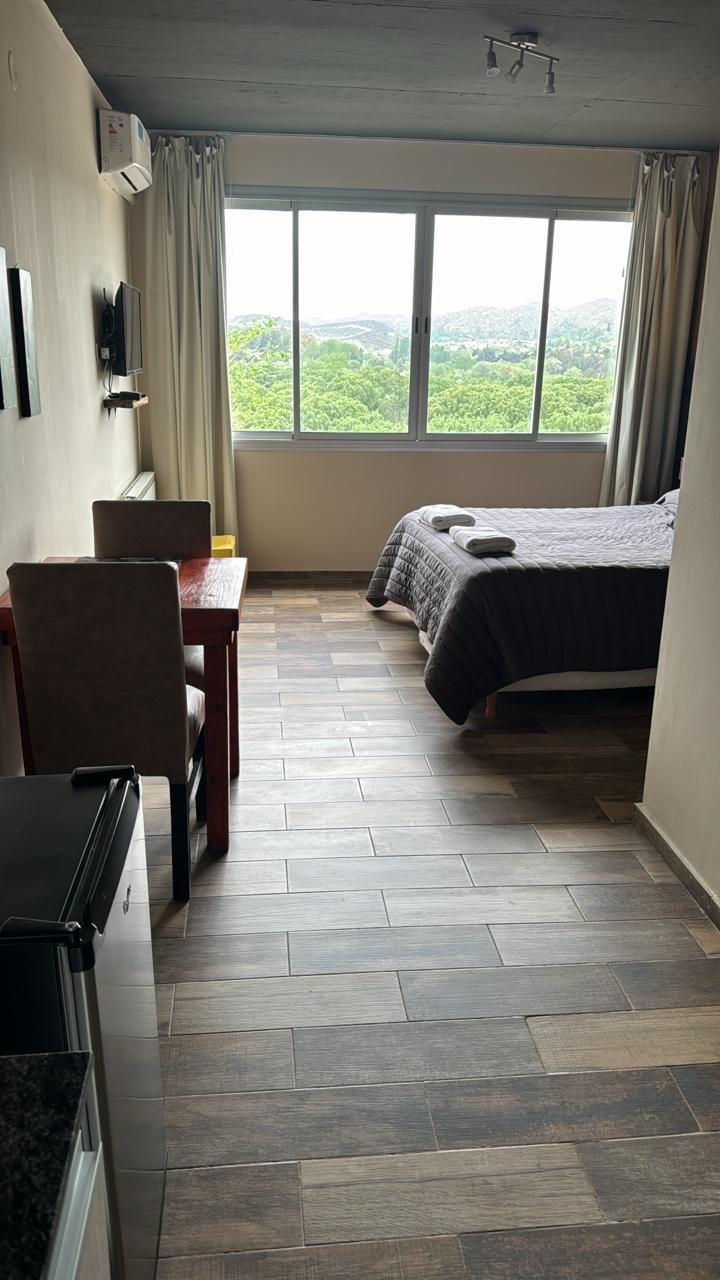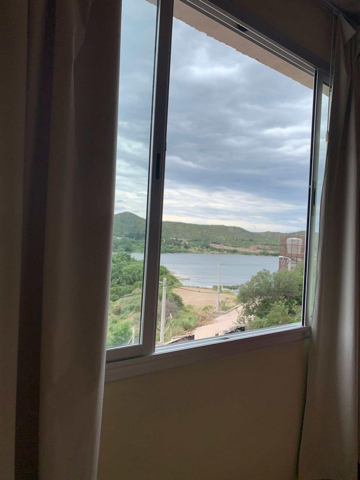 Monoambiente con vista al lago y a las sierras, equipado para 2 personas con: heladera, anafe, horno eléctrico, pava eléctrica y vajilla completa.