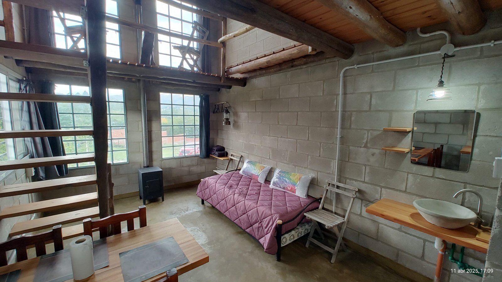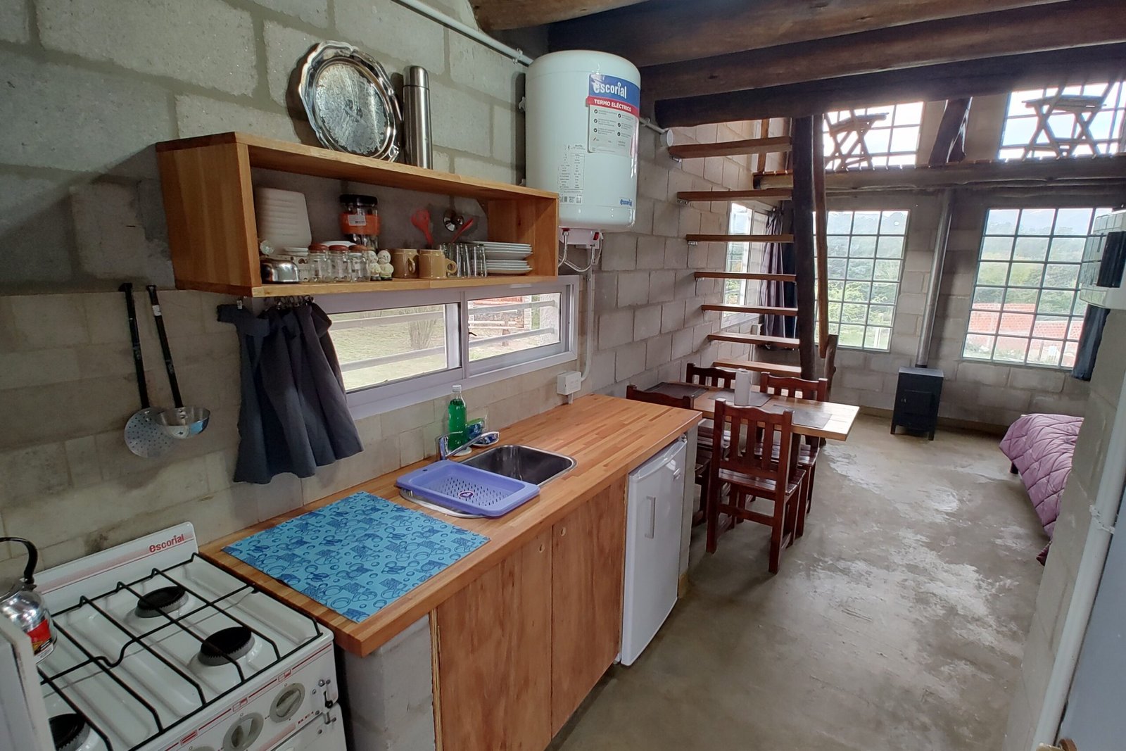 El alojamiento está preparado para recibir hasta 4 personas, con un ambiente integrado que combina comodidad y funcionalidad. En planta alta, cuenta con un dormitorio con cama matrimonial, mientras que en planta baja dispone de 2 camas individuales. Todas incluyen mantas (no se proveen sábanas ni toallas).