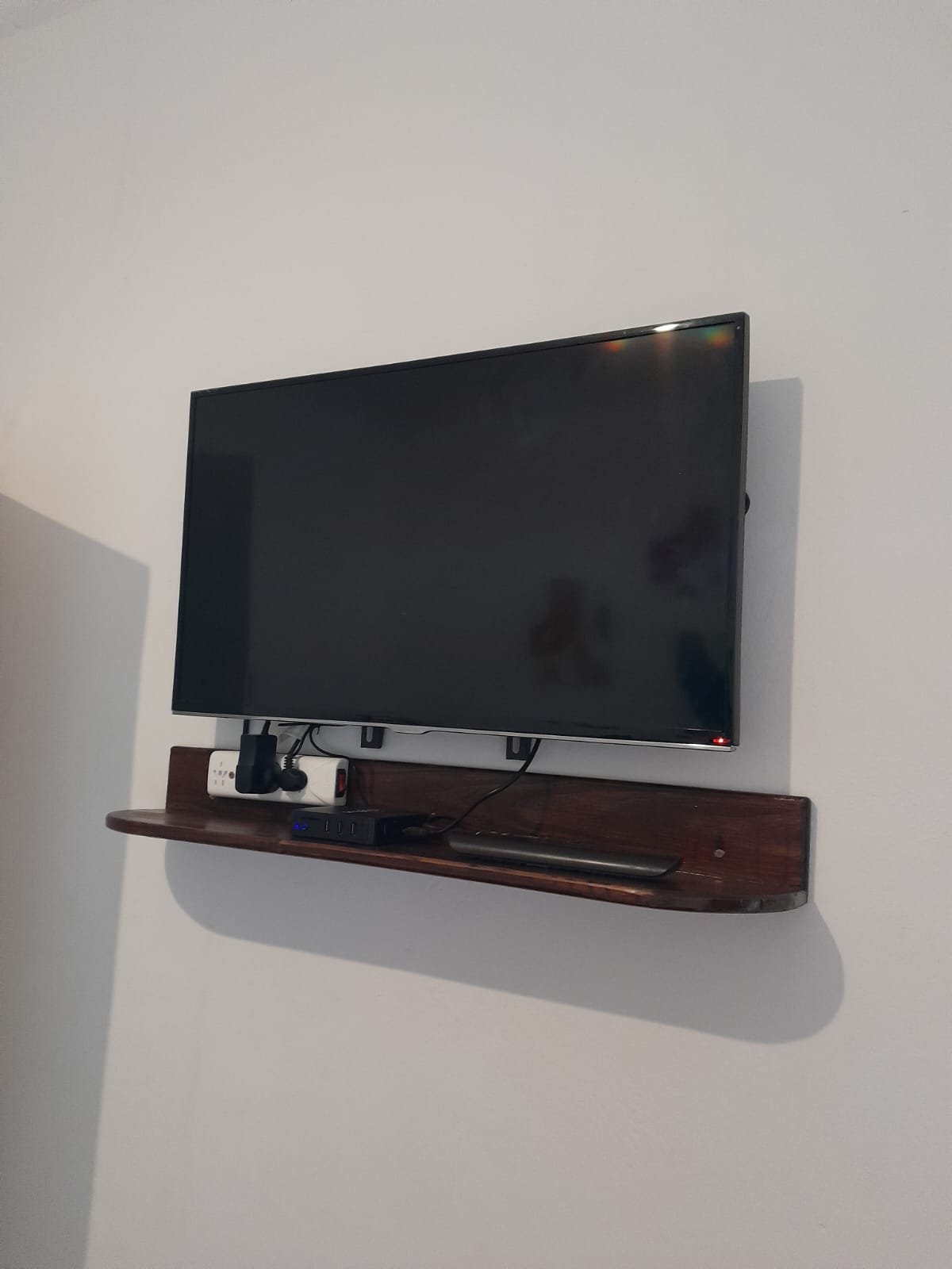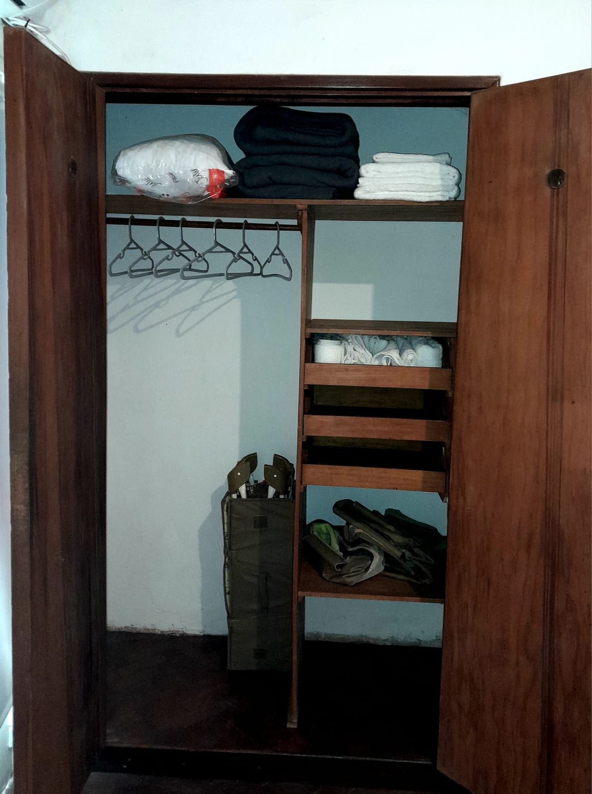 La habitación tiene una cama doble y un sofá cama, aire acondicionado frío/calor, TV con TV Box y un gran placard.
