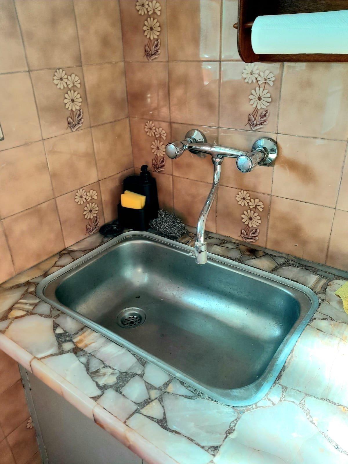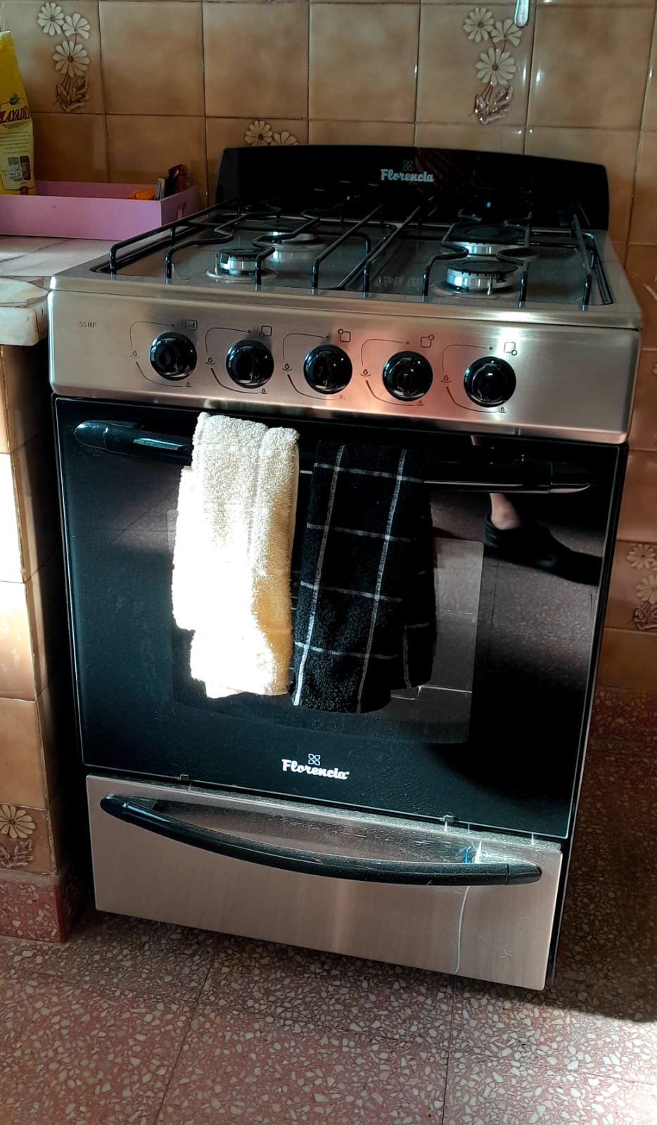La cocina es amplia y está equipada con todo lo necesario para cocinar: cocina con horno, heladera, pava eléctrica, batería de cocina y utensilios.